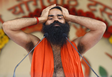 Indian yoga guru Swami Ramdev gestures as he teaches breathing exercises during a open air yoga camp in Kolkata March 21, 2007. Ramdev, a bare-chested guru who wears a saffron wraparound and shawl, is the rage in many parts of India and claims to cure illnesses through breathing exercises and traditional medicines. [Reuters]