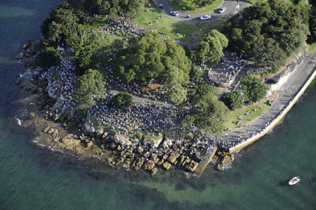 Onlookers crowd Lady Macquarie's Chair to watch Cunard ocean liners Queen Victoria and QE2 (unseen) pass each other in Sydney Harbour February 24, 2008 before the QE2 begins her final voyage ahead of becoming a floating hotel in Dubai and Queen Victoria continues her maiden 106-night-long world voyage. [Agencies]