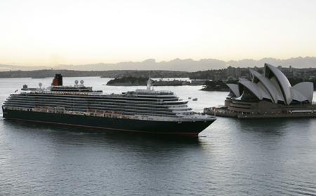 Cunard's newest ocean liner the Queen Victoria approaches the Sydney Opera House February 23, 2008, after arriving from Melbourne during her maiden 106-night-long world cruise. The 90,000 tonne liner, with a crew of more than 1,000 carries 2000 passengers and is 294 metres (321.52 yards) long. [Agencies]