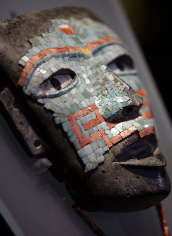A turquoise encrusted mask is displayed during a media preview of the "Isis and the feathered serpent" exhibition at Mexico City's National Museum of Anthrology and History February 27, 2008. The exhibition is largest temporary display in the museum's history and will be open from February 28 to June 15. [Agencies]