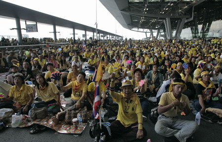 Anti-government protesters gesture during a rally at Bangkok's Suvarnabhumi Airport November 26, 2008. Anti-government protesters stormed Bangkok's main international airport and gunfire broke out on the streets of the Thai capital on Tuesday as a campaign to oust Prime Minister Somchai Wongsawat turned violent. [Agencies]