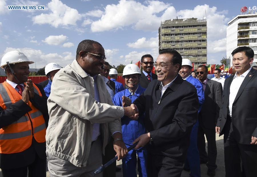Chinese Premier Li Keqiang (R) shakes hands with Ethiopian Prime Minister Hailemariam Desalegn during a visit to a light railway project in Addis Ababa, capital of Ethiopia, May 5, 2014. [Photo/Xinhua]