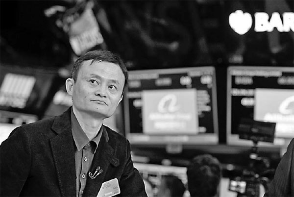 Jack Ma, founder and chairman of Alibaba Group, at the New York Stock Exchange on Sept 9, 2014. Alibaba was listed that day at the NYSE. The company saw its market value fall below $153 billion after its shares closed at $60.91 on Tuesday. Wang Lei / Xinhua |