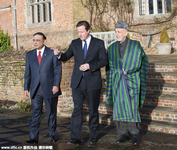 British Prime Minister David Cameron hosts a trilateral meeting with President Hamid Karzai of Afghanistan (in green) and President Asif Ali Zardari of Pakistan at Chequers, April 2, 2013. [Photo/IC]