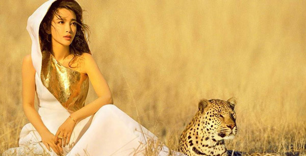 Actress Li Bingbing poses with a leopard. [Photo/Official Weibo account of Our Street Style] |