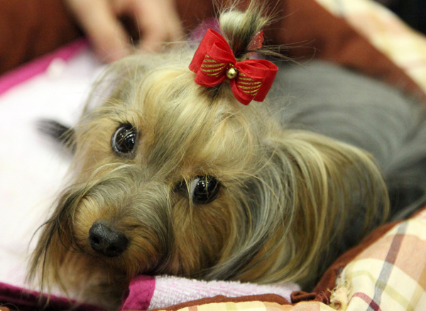 12月18日,在比利时布鲁塞尔,一只参加犬博会的小狗被主人佩戴上了装饰。第115届布鲁塞尔犬博会17日至18日举行,共有来自21个国家的3576只、250个品种的大小犬类参加。布鲁塞尔犬博会是国际犬协的重大赛事之一。 新华社记者 王晓郡摄