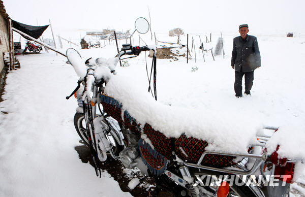 6月18日,哈密市白石头乡的一位牧民在雪地里行走。新华社发(朱正华摄)